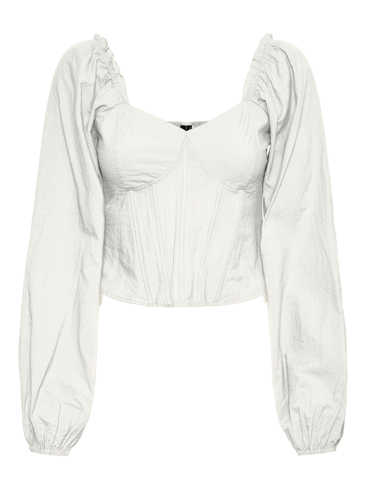 Cropped top with corset details, elastic at the shoulders, and balloon sleeves. Style this stunning top with a pair of low waisted jeans and some heeled sandals for a gorgeous look.