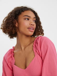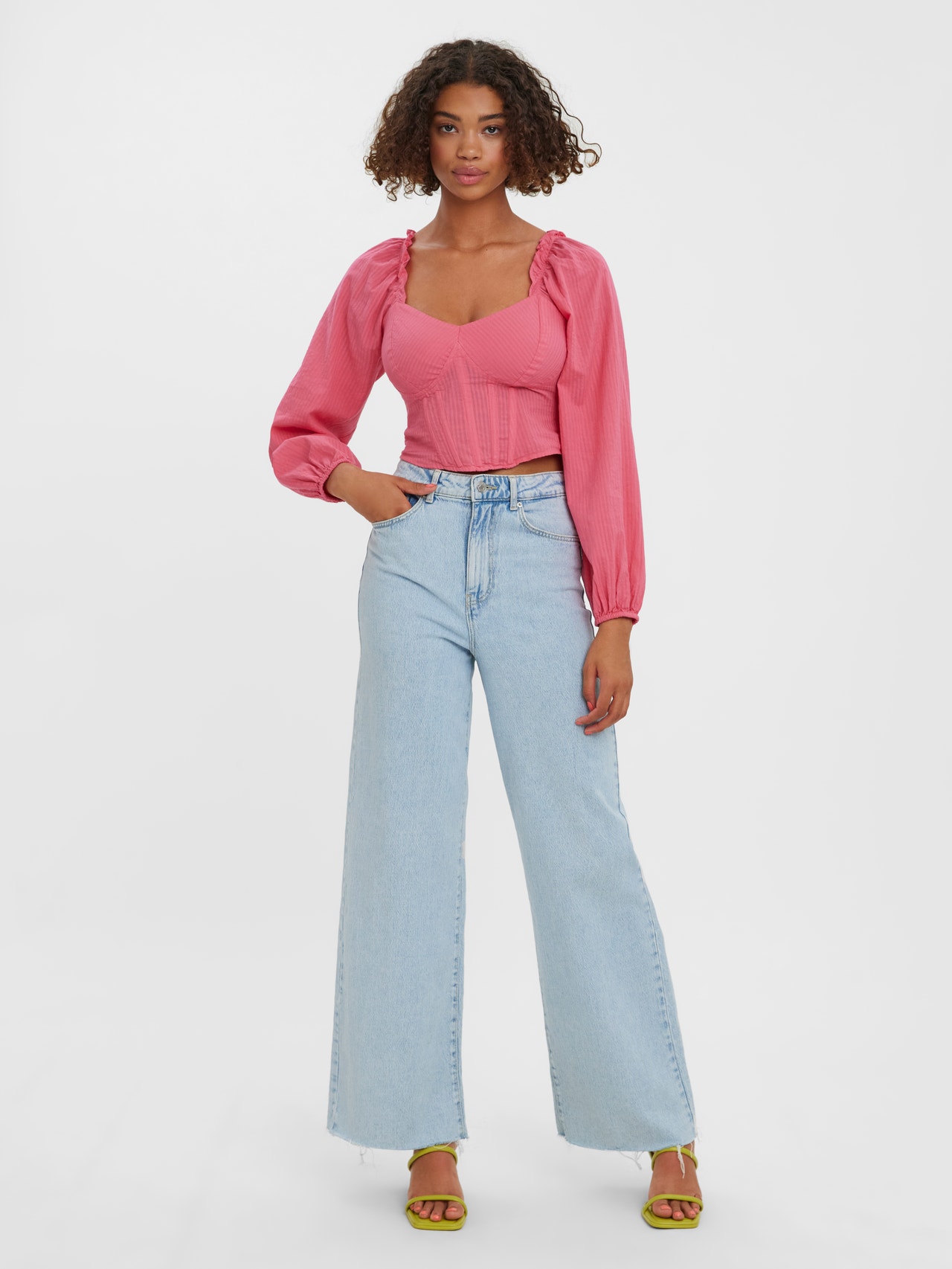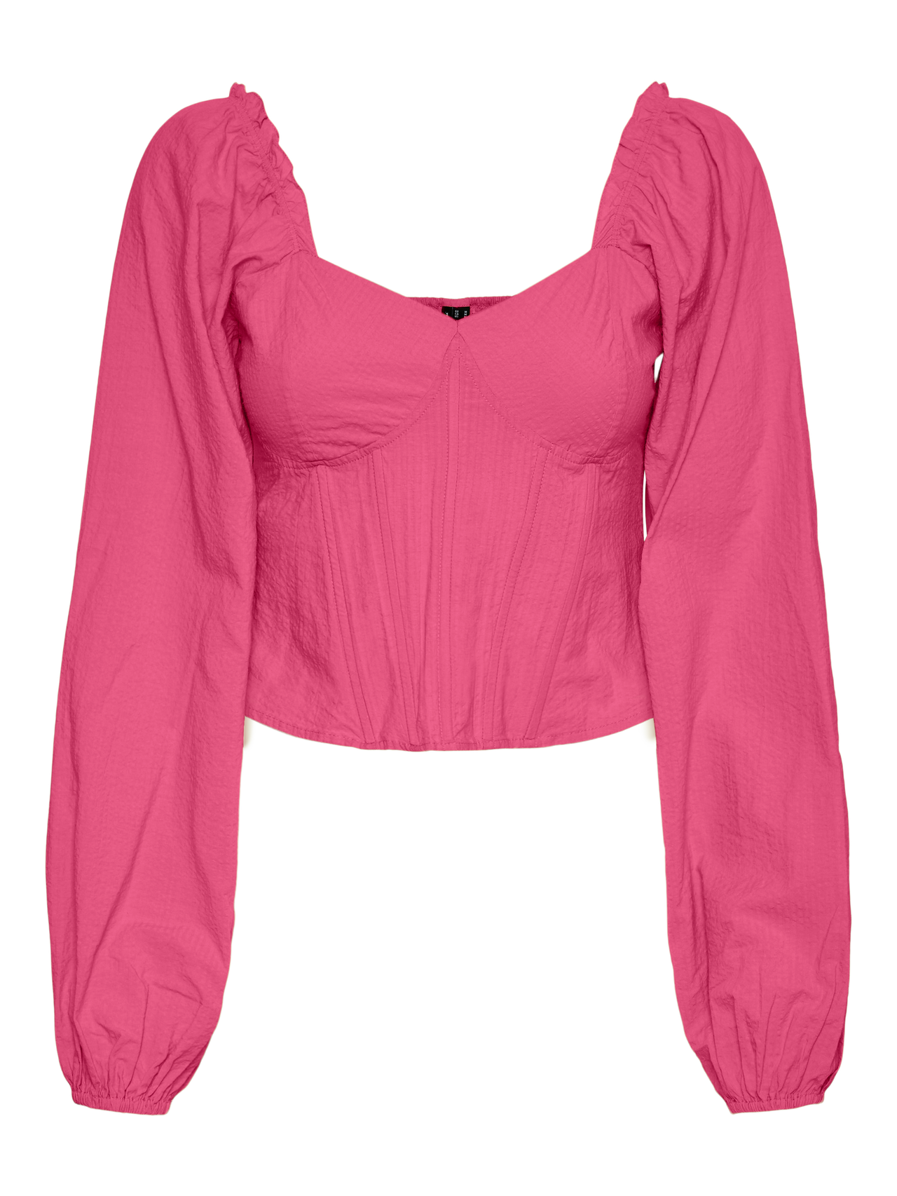 Cropped top with corset details, elastic at the shoulders, and balloon sleeves. Style this stunning top with a pair of low waisted jeans and some heeled sandals for a gorgeous look.