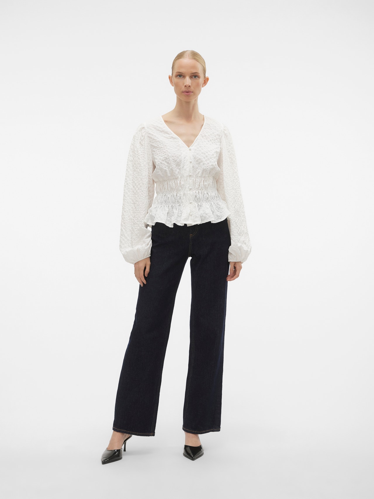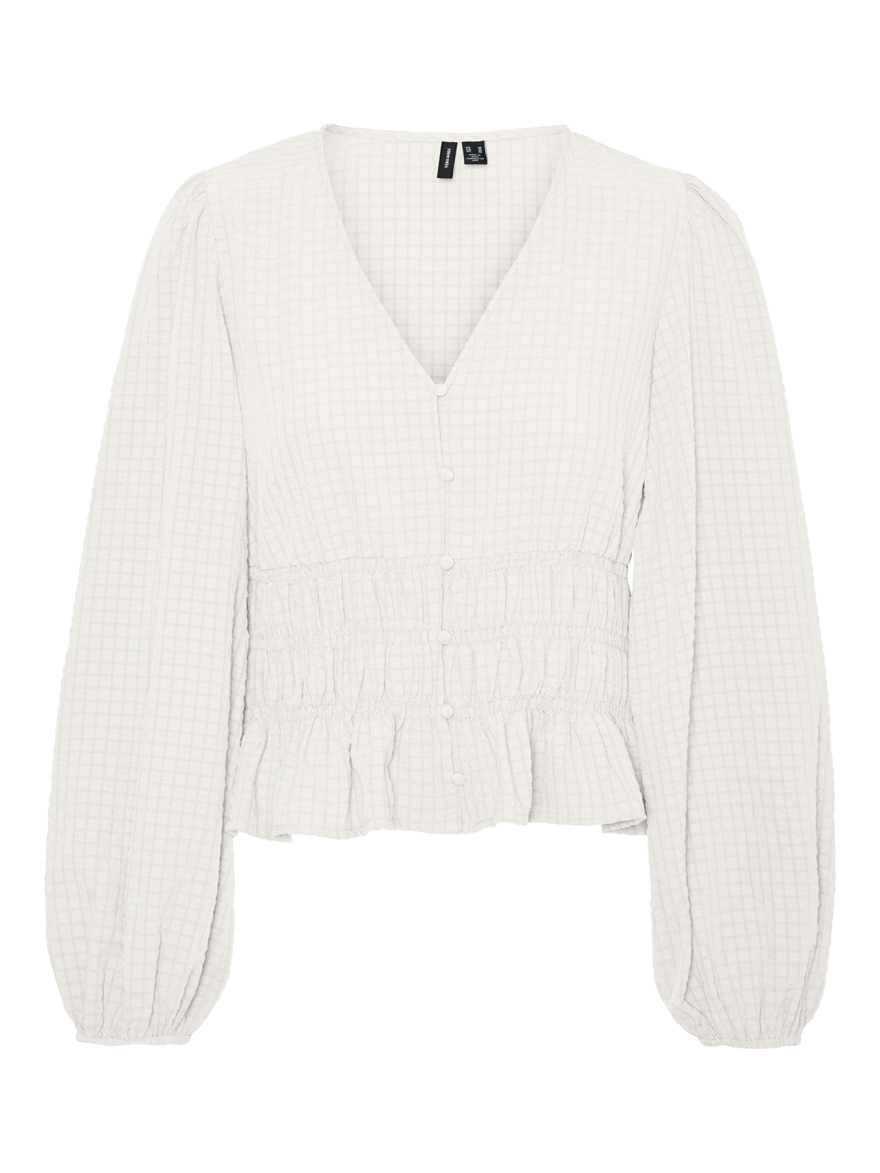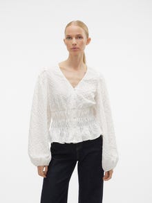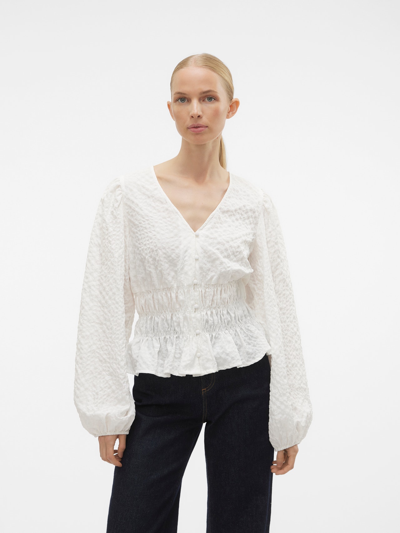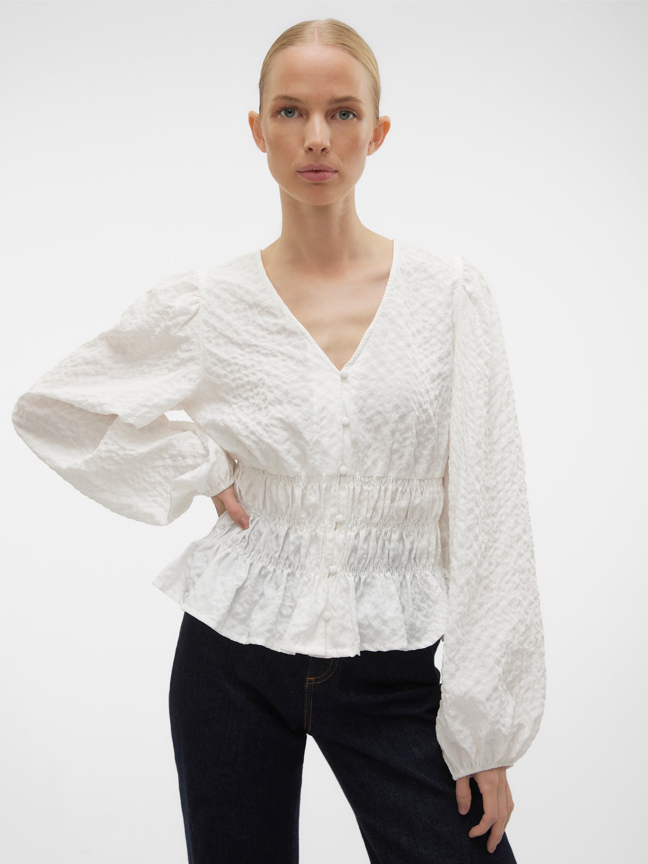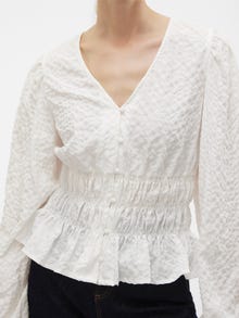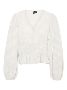 Bluser er det mest allsidige garderobeplagget – de kan brukes med nesten alt fra jeans, bukser, skjørt osv. Og våre styles er intet unntak. Denne stylen tilfører et sofistikert preg til din look på et blunk. - Produkttype : Bluse - Hals : V-hals - Erme : Lange ermer - Ermer : Volumermer - Lukking : Knappelukking - Lengde/størrelse : Kort - Detaljer : Smock-detalj - Passform : Regular Fit