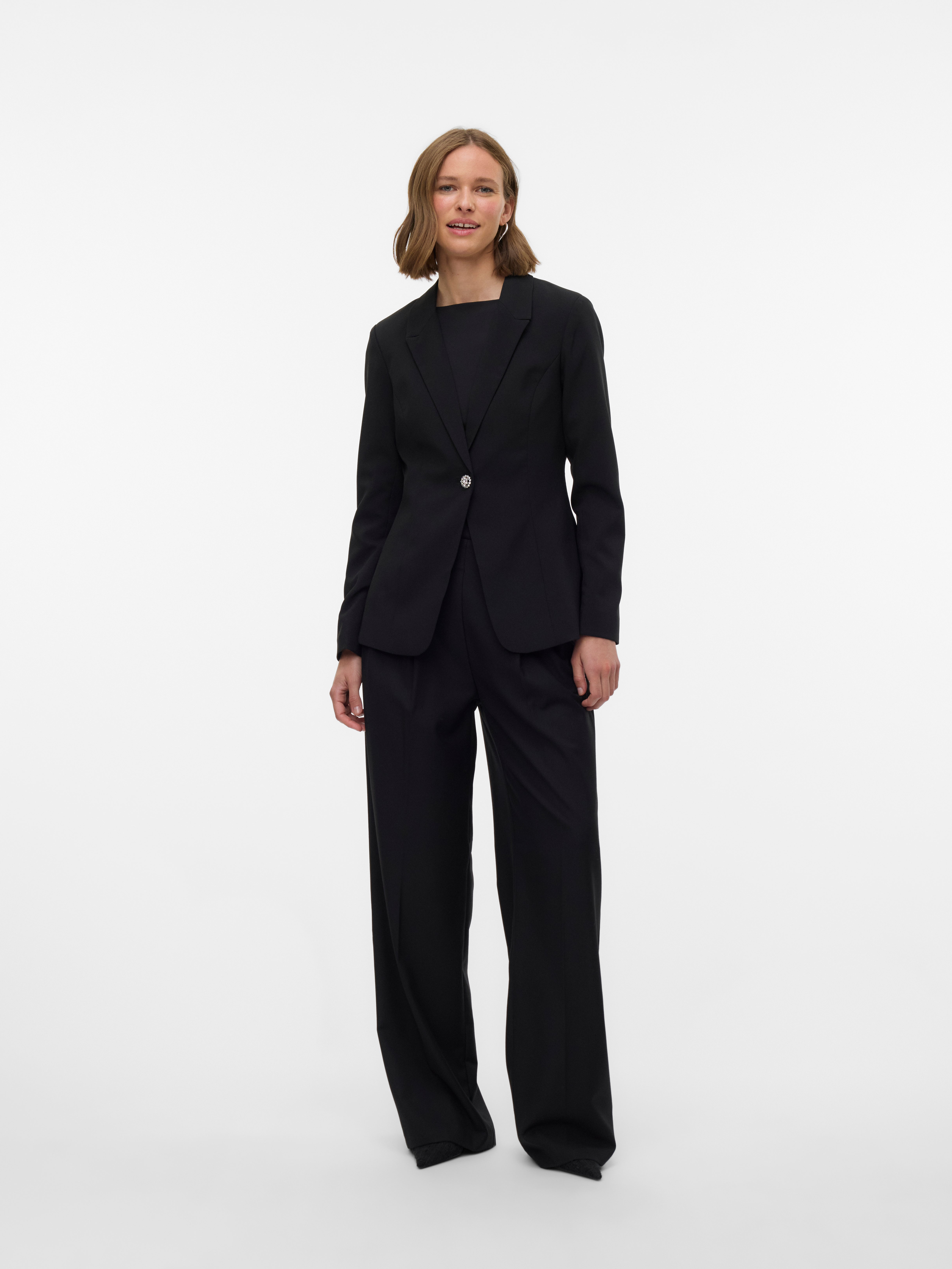 Usikker på hva du skal ha på deg? Sleng på deg en blazer. Denne blazeren er din stilige go-to. Selv når du bruker den over en ensfarget T-skjorte, tilfører blazeren alltid sin egen eleganse og stil. Style med en jeans med wide fit og høye hæler for en oppgradert hverdagslook.