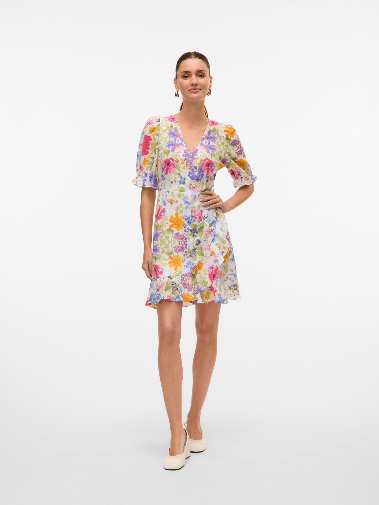 Kle deg i fine omslagskjoler. Denne omslagskjolen er en flott måte å vise fram figuren din på og er enkel å justere og style slik du ønsker. Omslagseffekten lar deg knyte den så løst eller stramt du vil. Style med et par fine, åpne sandaler for en feminin sommerlook. - Produkttype : Kjole - Hals : V-hals - Erme : Ermeløs - Lukking : Omslagslukking - Lengde/størrelse : Kort - Mønster : Printet er gjentatt over hele overflaten av produktet - Passform : Regular Fit
