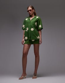 Topshop co-ord resort shirt in green with raffia flowers - MGREEN
