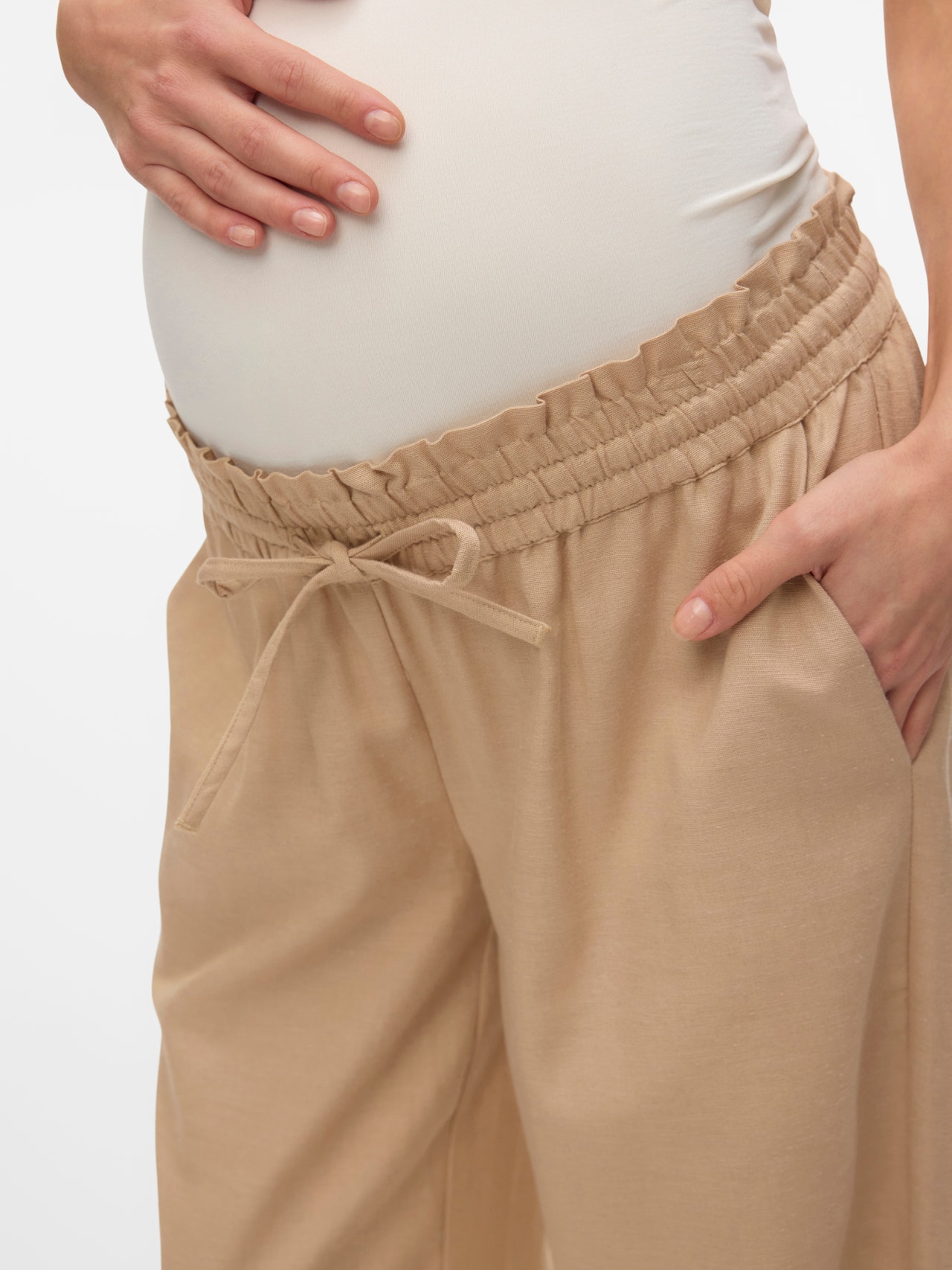 Finn den perfekte buksen som er designet for å passe gjennom hele graviditeten, og kle deg til både hverdagsaktiviteter og festlige anledninger. - Produkttype : Bukser med vide ben - Lukking : Snøring - Lommer : Sidelommer - Høyde til midje : Middels høyt snitt - Detaljer : Snøringdetalj, Elastisk linning, Magebånd som sitter under magen for ekstra komfort - Passform : Wide Leg Fit