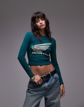 Topshop graphic license Honda long sleeve top in green - DGREEN