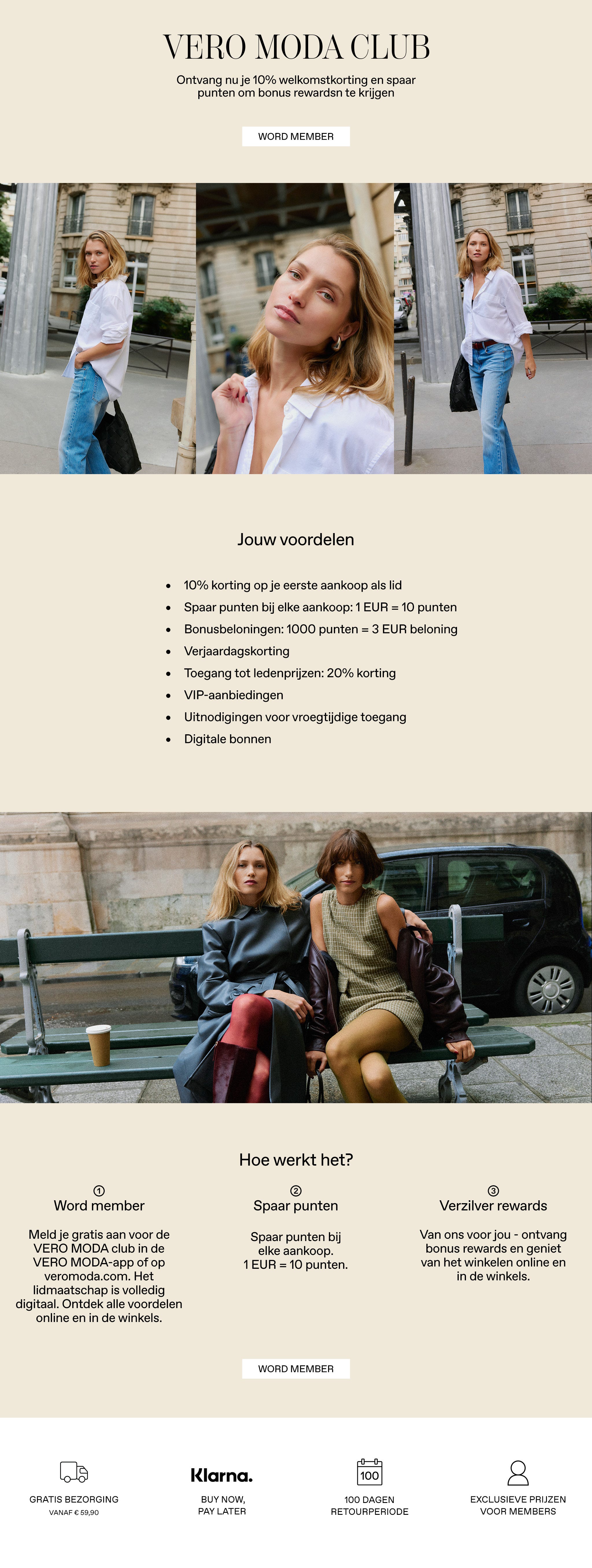 Je vindt je nieuwste aanbiedingen en rewards op je accountpagina in de VERO MODA-app of op veromoda.com. Houd er rekening mee dat eenmaal ingewisselde rewards niet kunnen worden geretourneerd of opnieuw kunnen worden gebruikt. Als je een artikel retourneert, worden de punten die je hebt verdiend met dat artikel afgetrokken van je puntensaldo.
