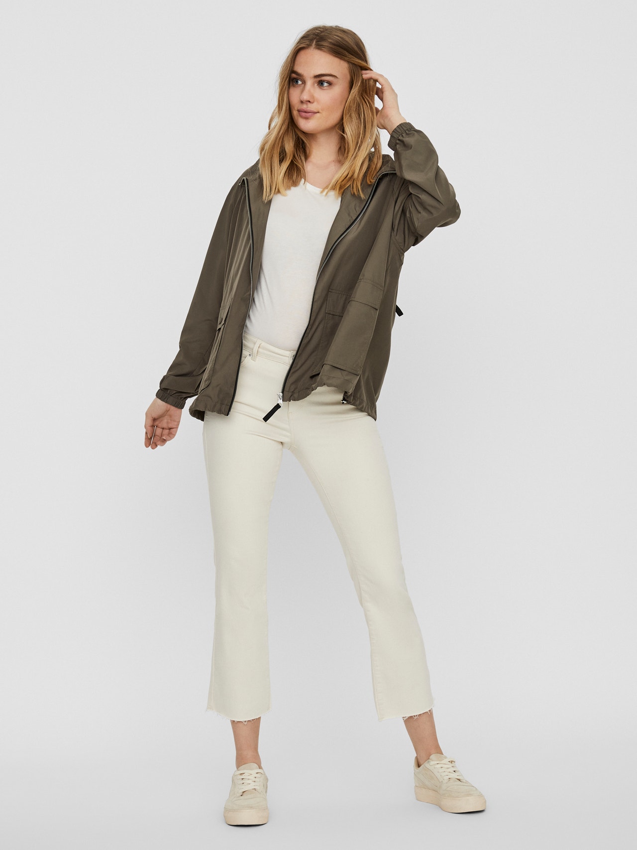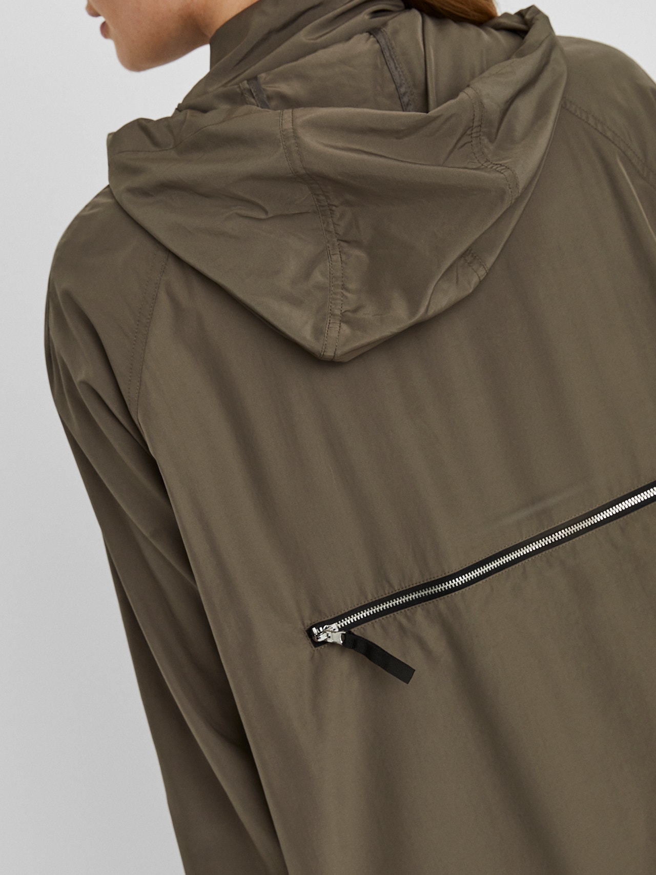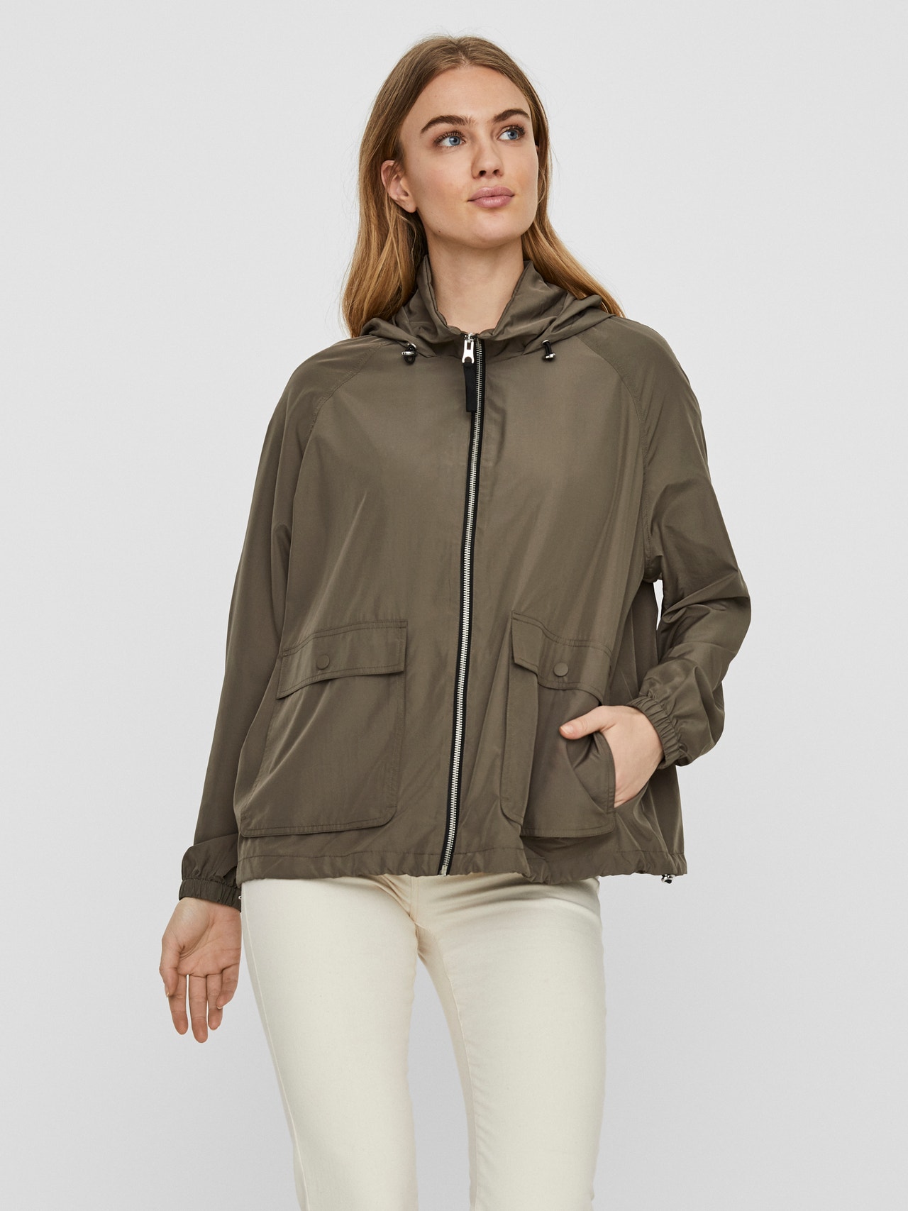- Hooded jacket with zip details. - Regular fit. - Soft material with inner lining. - Zip closure in the front. - Pocket with zip closure in the back. - Front pockets with press button closure. - Drawstrings at the hood and hem. - Elastic at the cuffs. - Length: 65 cm in a size S. - The model is 177 cm tall and wears a size S. Hooded jacket with zip closure, front pockets and one pocket with zip closure in the back. The jacket has drawstrings at the hood and hem. Style it with jeans and sneakers.