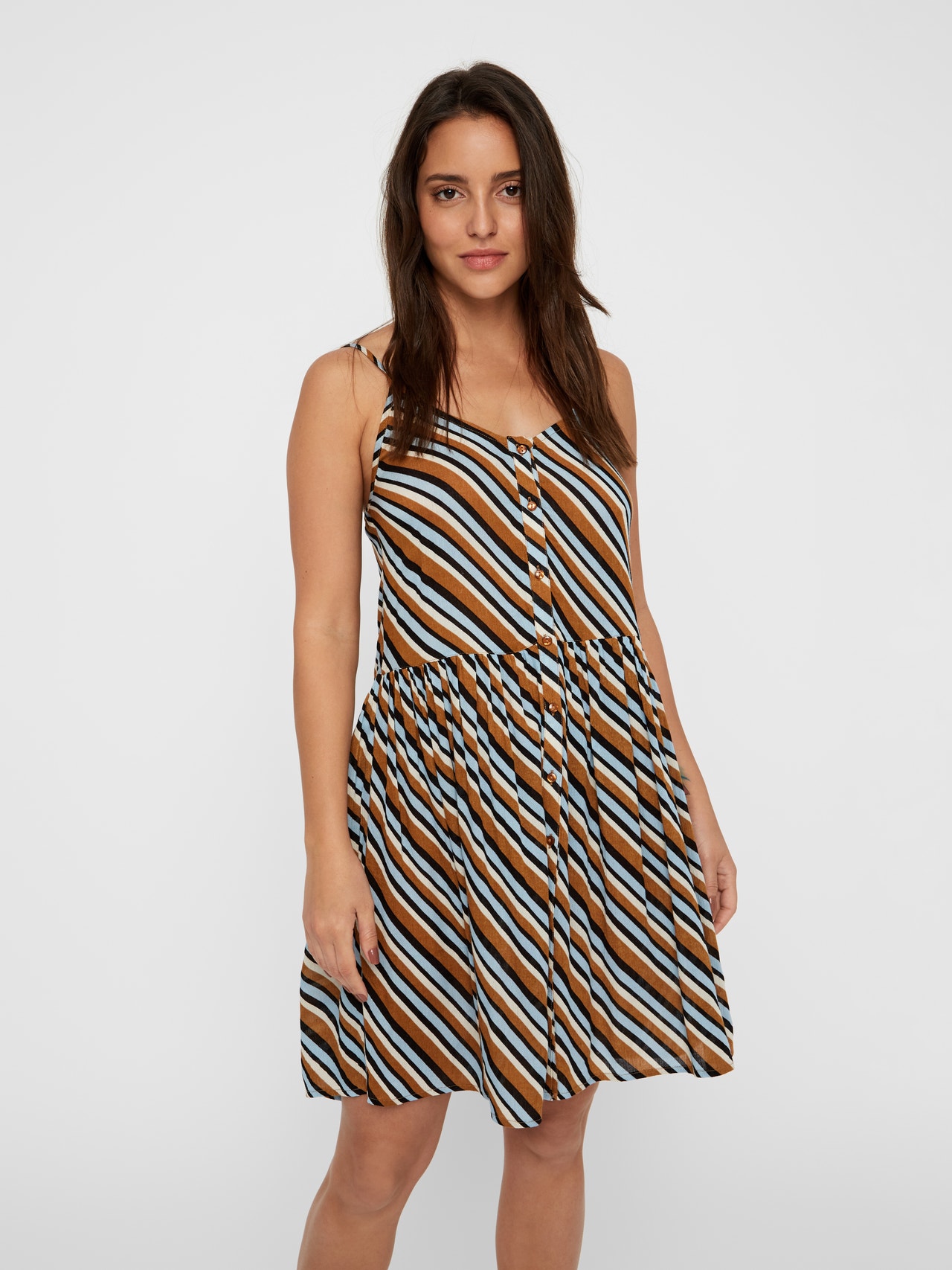 LDS SHORT DRESS W FRONT BOTTON DOWN AND SLIM STRAPS. AOP