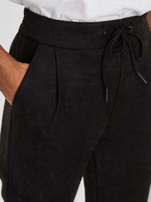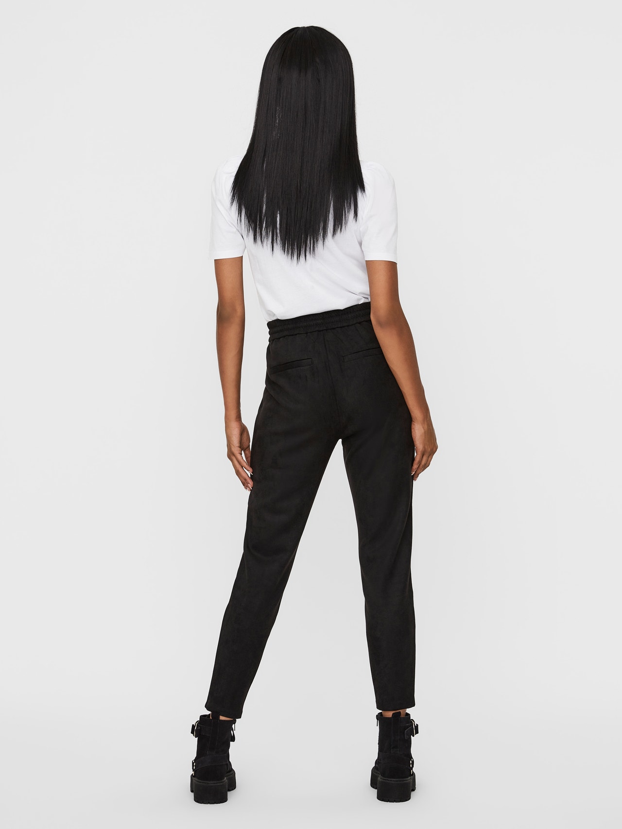 Faux suede trousers with normal waist and slit pockets. The trousers have drawstrings and elastic at the waist. Style them with chunky boots for a super cool look.