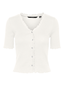 Short sleeved cardigan with fake buttons in the front, frills by the neckline, sleeve- and bottom hem, and a v-neckline. Style this cute cardigan with some high-waisted trousers and a cool pair of heeled sandals for a chic and beautiful everyday look.