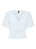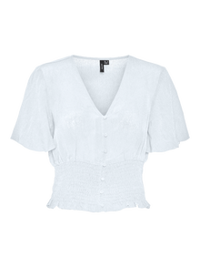 Smock top with a v-neckline, a button closure in the front, smock material at the waist, and big, 2/4 sleeves. Style it with a cute skirt and some heeled sandals for a great look.