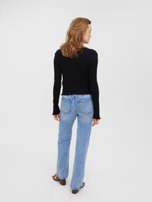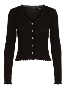 Long-sleeved cardigan with a ribbed structure, V-neck, and buttons for closure. Style this cardigan with a high waisted skirt and a pair of long boots for a simple, stylish look.