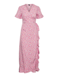 Long wrap dress with a tie-band at the side, cutline at the waist, and ruffles at the sleeves. Style this stunning dress with a pair of heels and a blazer for a gorgeous party look.