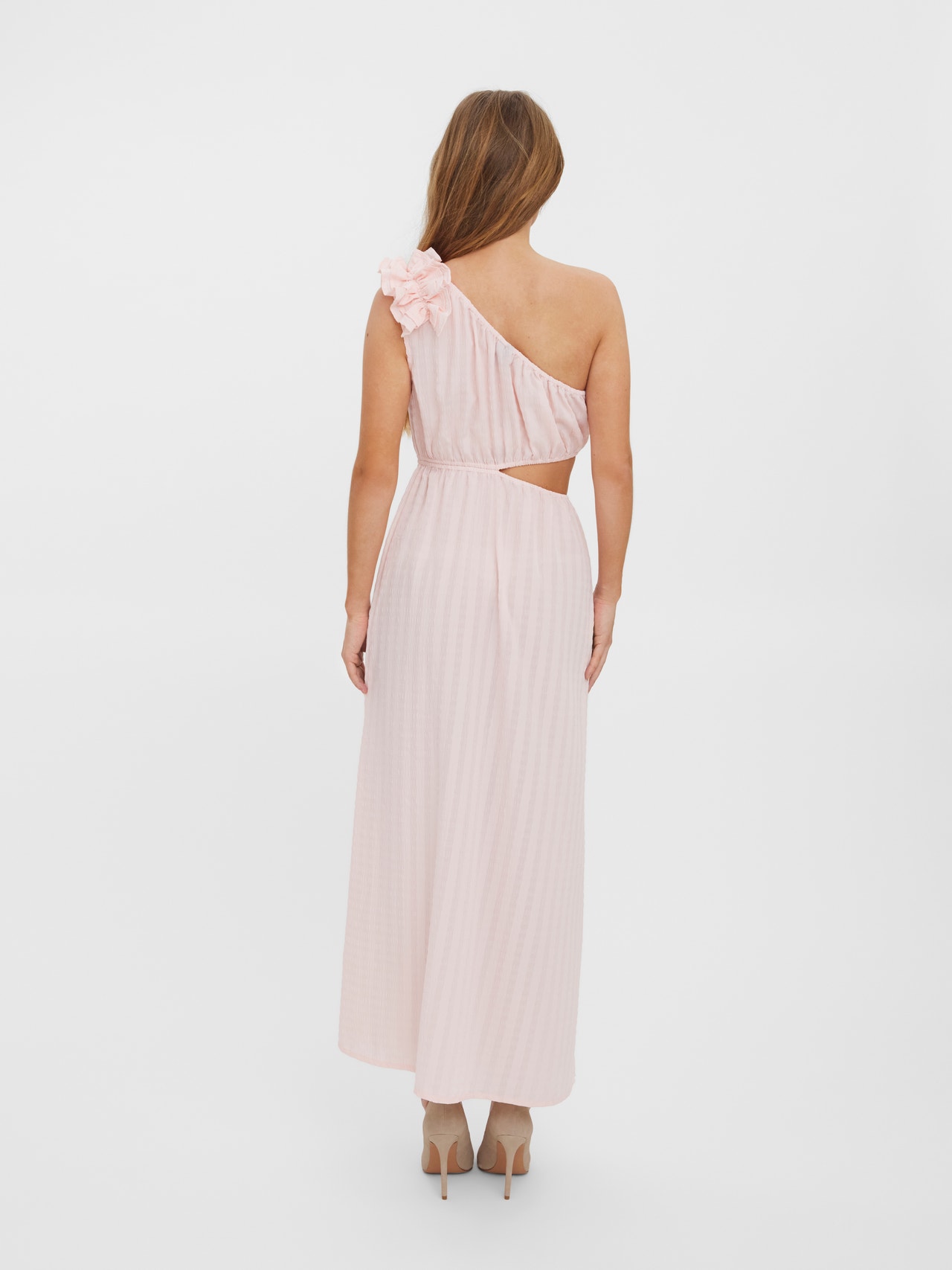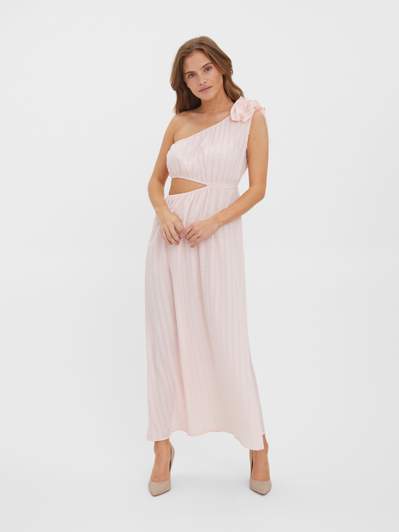 Maxi dress with one shoulder, cu-out detail at the waist, and elastic details. Style this gorgeous dress with a pair of slippers and a cute summer hat for a perfect look.