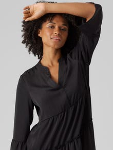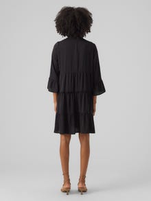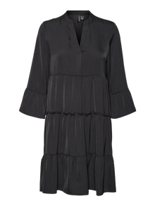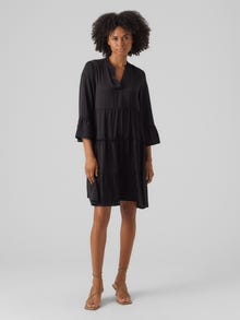 Deze jurk is perfect voor dagen waarop je het lastig vindt om een outfit samen te stellen. De jurk combineert comfort en stijl, waardoor je hem perfect elke dag kunt dragen. Draag het naar wens casual of opvallend. - Producttype : Jurk - Hals : V-Hals - Mouw : 3/4 mouwen - Mouwen : Wijde mouwen - Lengte/maat : Kort - Details : Naad bij de taille, Ruches - Pasvorm : Regular fit