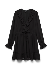 Każda impreza zasługuje na odpowiednią sukienkę. Ta przepiękna sukienka wprowadzi cię w imprezowy nastrój od razu. Noś ją do butów na obcasie i ulubionych dodatków w odświętnych i zjawiskowych stylizacjach imprezowych. - Rodzaj produktu : Sukienka - Szyja : Dekolt w serek - Rękaw : Długie rękawy - Długość/rozmiar : Krótki - Szczegóły : Falbanki - Krój : Krój regularny