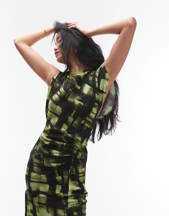 Topshop sliced sleeve ruched side maxi dress in green check print - DGREEN