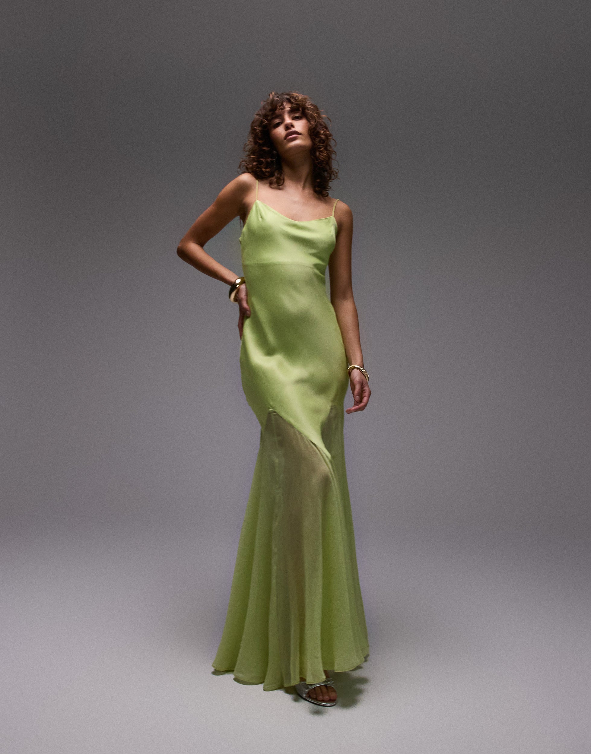 Topshop premium mixed fabric godet hem midi dress in lime - LGREEN