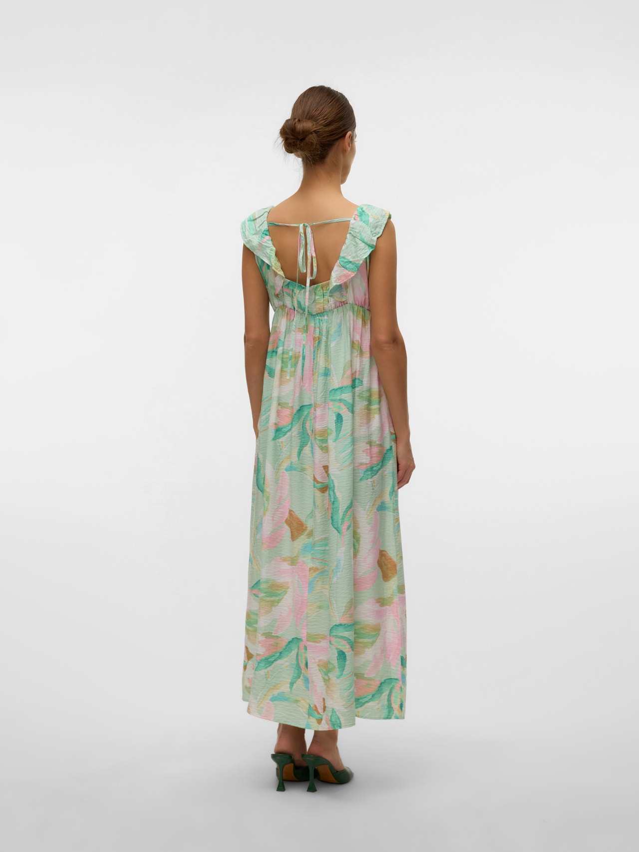 Wprowadź do garderoby wygodę i kolor dzięki pięknym sukienkom podtrzymującym brzuch i pasującym na każdą okazję, czy to na zwykły dzień czy na specjalną uroczystość.. - Rodzaj produktu : Sukienka - Szyja : Dekolt w serek - Rękaw : Bez rękawów - Długość/rozmiar : Do kostek - Szczegóły : Falbanki - Krój : Krój regularny