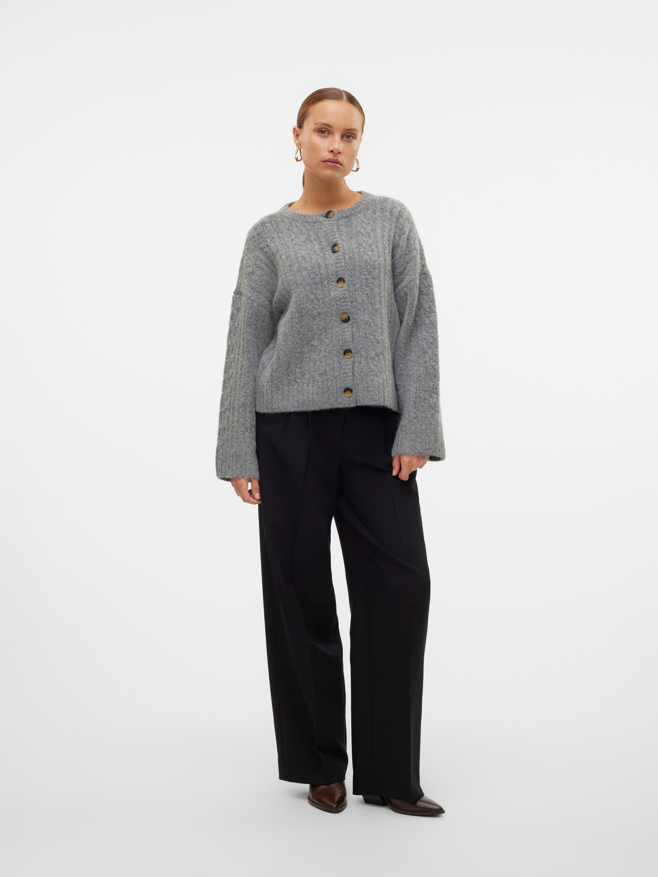 Kot prikupen sloj ali kot šik, pleten jopič je ta debel pleten jopič popoln dodatek k vaši garderobi. Enostaven in udoben slog, ki vas ohranja toplo in udobno. Nosite ga kot dodatno plast k že elegantnemu outfitu ali pa omilite svoj svečan videz z dodatkom udobja. - Vrsta izdelka : Jopica - Vrat : Okrogel izrez - Rokav : Dolgi rokavi (D/R) - Manšete : Rebraste manšete - Zaključevanje : Zapenjanje na gumb - Prileganje : Običajno prileganje