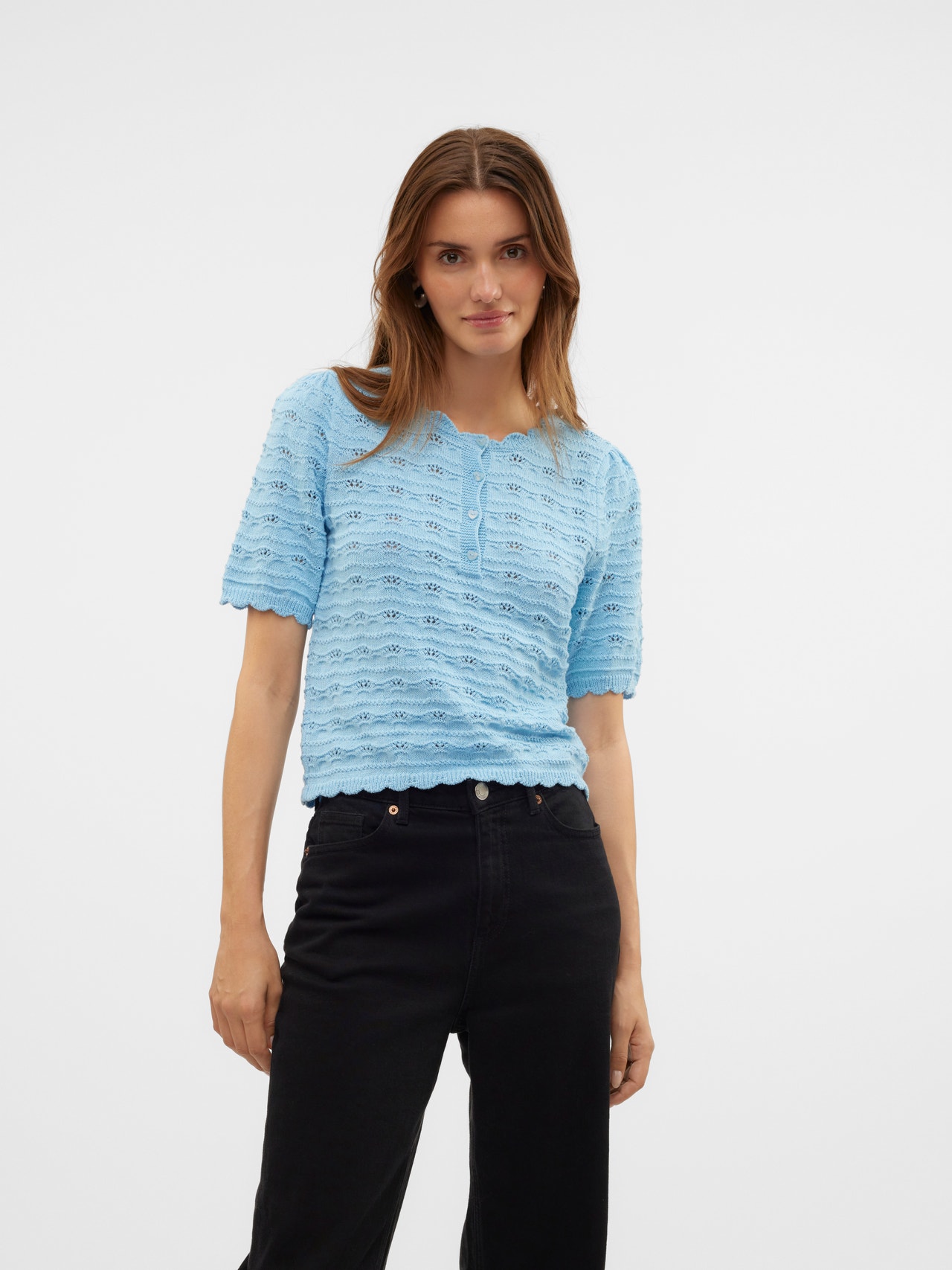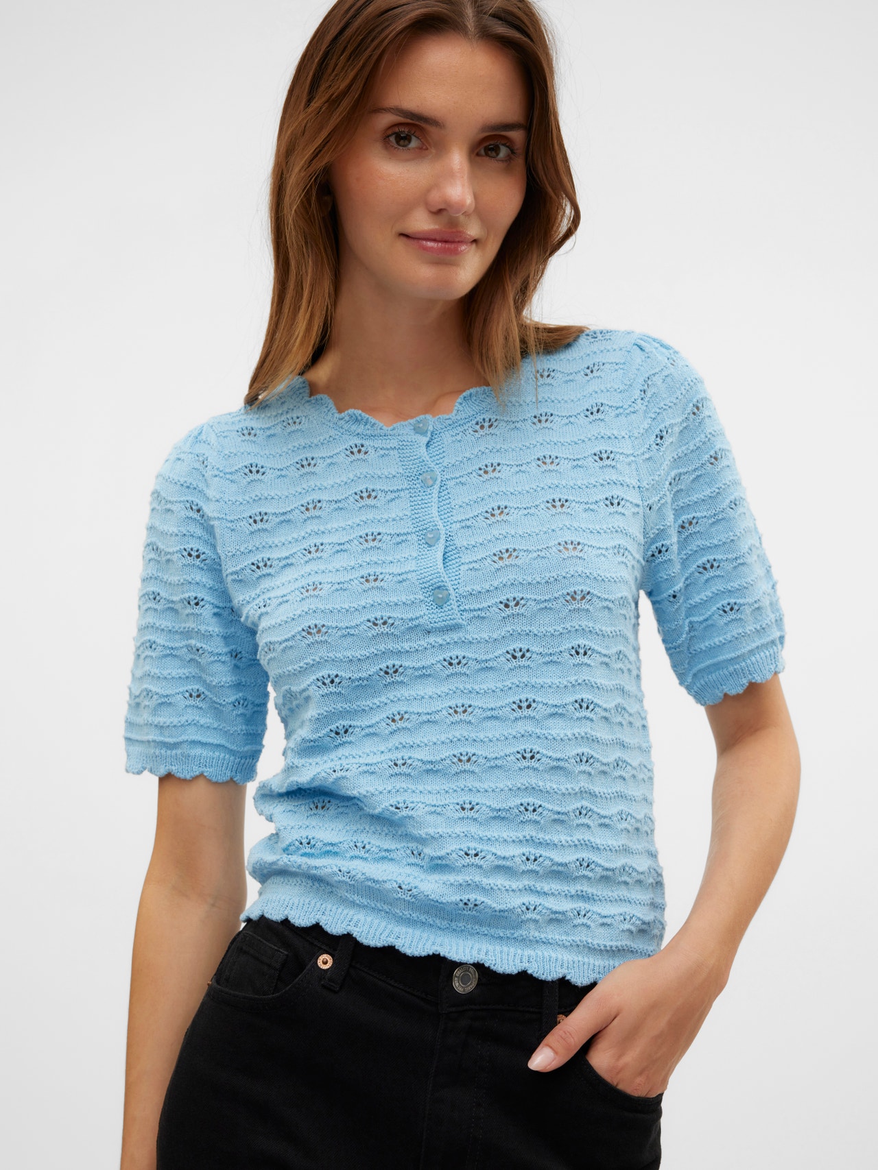 Brez tvojega najljubšega puloverja nobena omara ni popolna, in ta bi lahko postal tvoj novi najljubši zgornji sloj. Popoln način, da ostanete toplo in elegantno brez kompromisov glede udobja. Čista popolnost!. - Vrsta izdelka : Pleten pulover - Vrat : Okrogel izrez - Rokav : Kratki rokavi (K/R) - Dodatne podrobnosti : Detajl gumba - Prileganje : Običajno prileganje