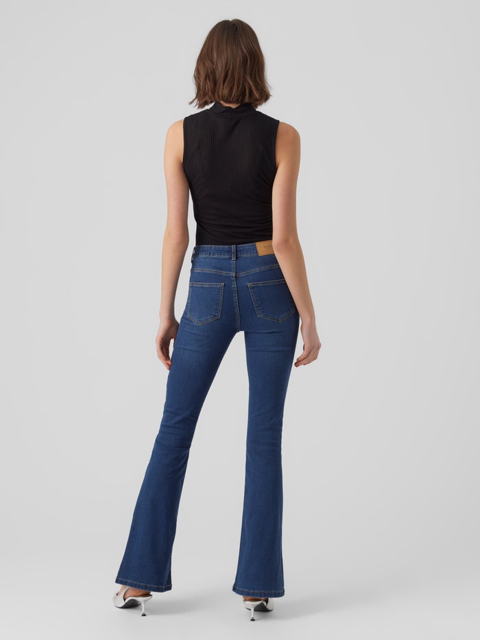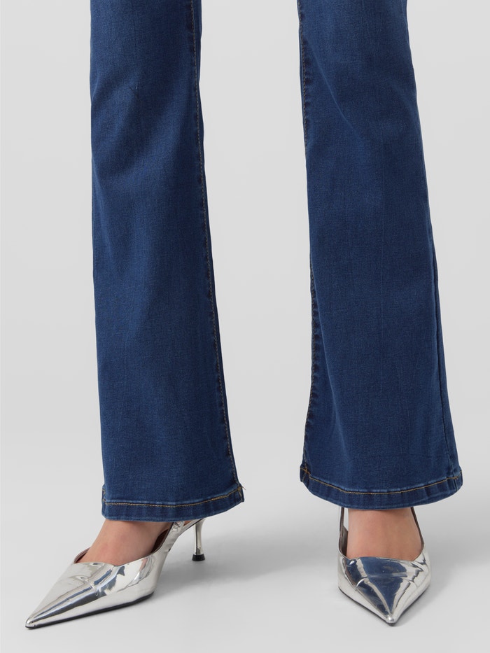 Flared jeans with a high waist, five pockets, a button and zipper closure in the front, and belt loops. Style these cool jeans with a classic shirt, a knitted vest on top, and some heeled boots for a chic and comfy autumn look.