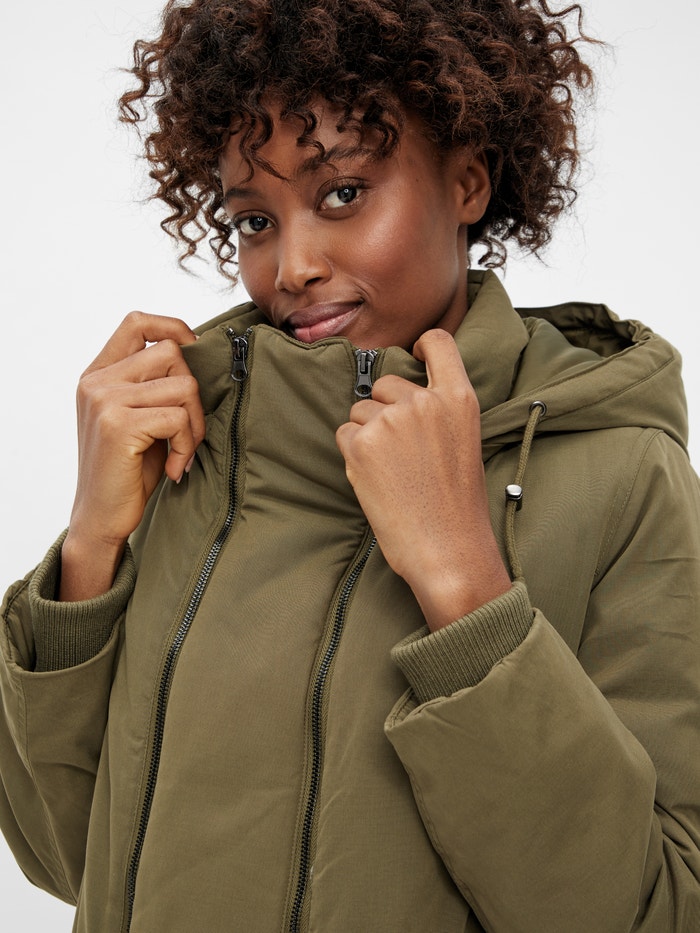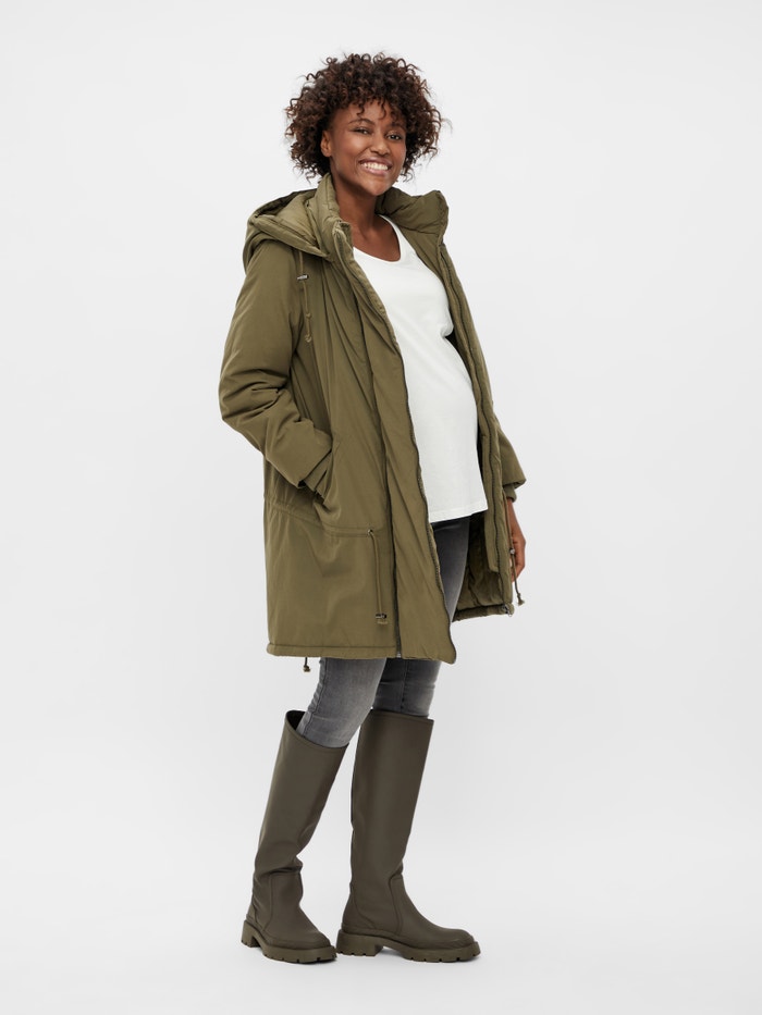 LADIES MATERNITY JACKET. DELIVERED WITH 1 SEPERATE PANEL, WHICH MAKES IT POSSIBLE TO USE THE JACKET BEFORE AND AFTER BIRTH. DETACHABLE HOOD, STRING IN TUNEL BELOW BELLY & FRONT POCKETS W/ ZIPPER