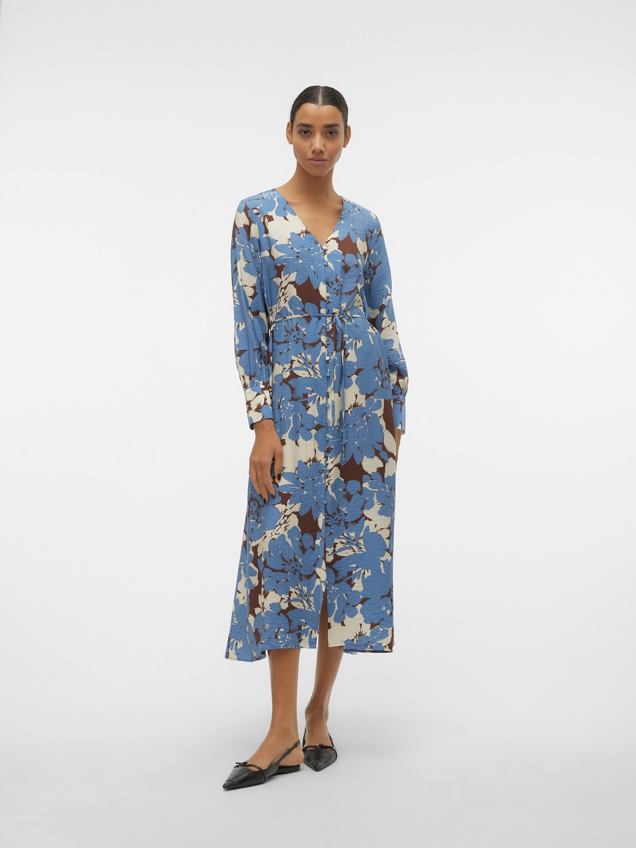 Denna klänning är det perfekta valet de dagar då det känns omöjligt att få ihop en outfit. Kombinationen av komfort och stil gör denna klänning till ett perfekt vardagsmåste. Styla upp eller ner den beroende på smak. - Produkttyp : Klänning - Nacken : V-ringning - Manga : Långa ärmar - Manschetter : Höga manschetter - Stängning : Knappstängning, Stängning med bälte - Längd/storlek : Ankellängd - Detaljer : Bälte i midjan - Passform : Normal passform