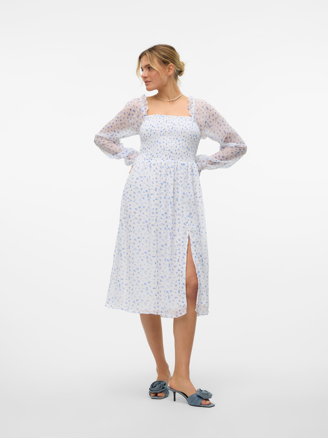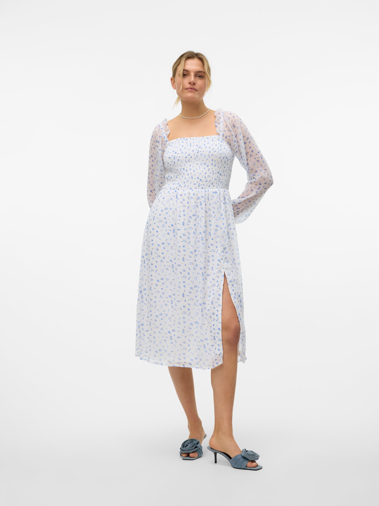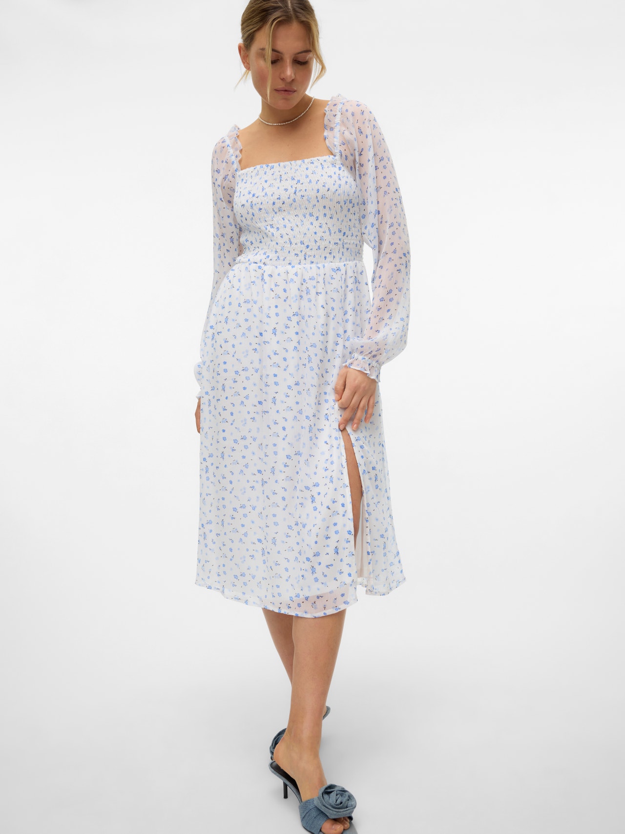 Blomstertryck lägger till precis rätt mängd feminin touch till din look och gör den blomstertryckta klänningen till det perfekta tillägget till din sommargarderob. Om looken blir för söt kan du enkelt lägga till ett par coola sneakers för att tona ner den lite. Glöm inte dina favorittillbehör!. - Produkttyp : Klänning - Nacken : Fyrkantig hals - Ärm : Långa ärmar - Ärmar : Rymliga ärmar - Manschetter : Elastiska manschetter - Foder : Polyesterfoder för en ogenomskinlig look - Detaljer : Smockdetalj - Print : Trycket upprepas över hela produktens yta - Passform : Normal passform