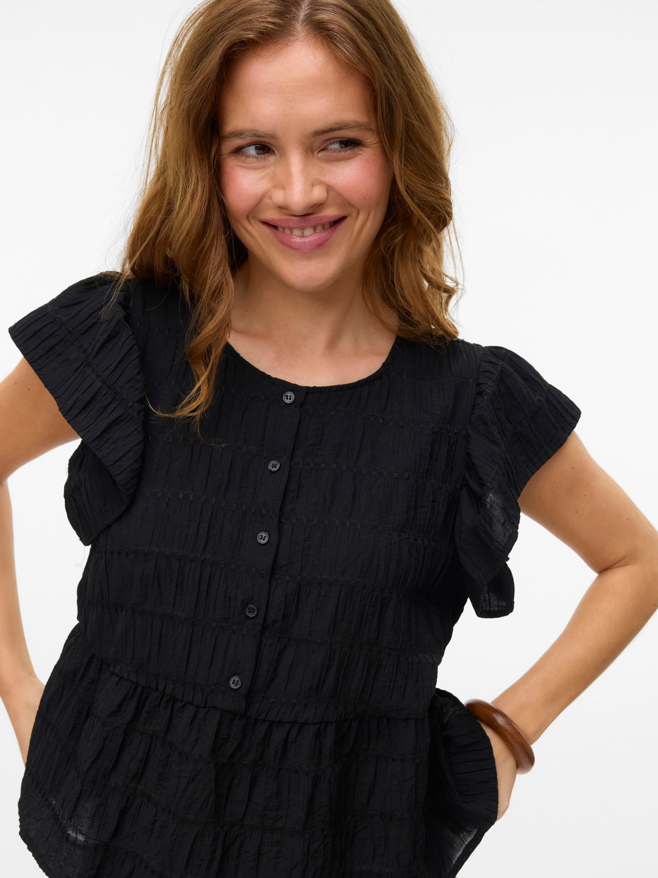 - Detaljer : Knappdetalj, Skärning i midjan, Veck