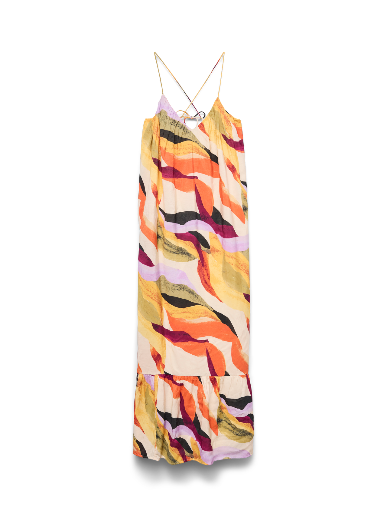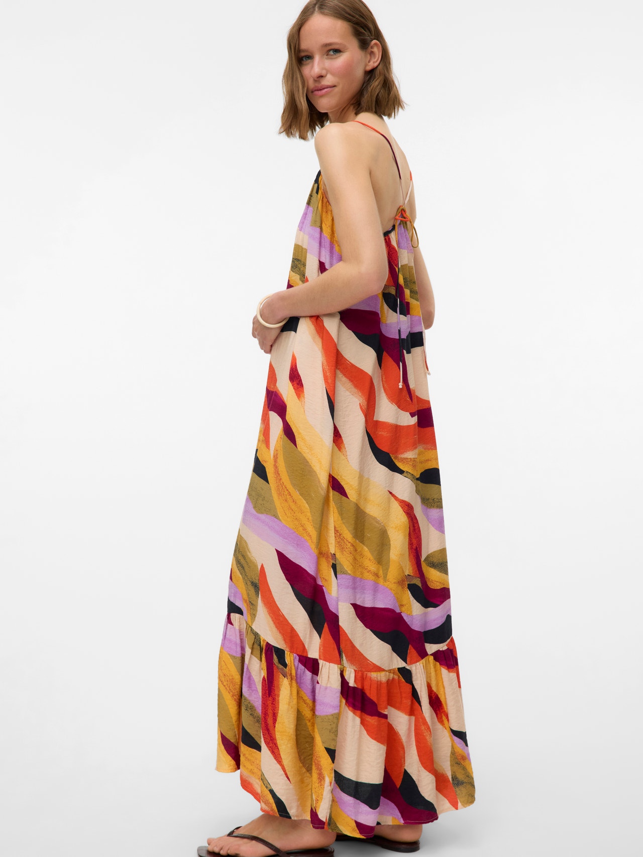 En maxiklänning om dagen håller alla kriser borta. Maxiklänningar är både eleganta och feminina, och den här utgör inget undantag. Style den med platta sandaler för en enkel, luftig sommarlook eller lägg till pumps med klackar för en trendig kvällslook. - Produkttyp : Klänning - Nacken : V-ringning - Ärm : Ärmlös - Bälten : Korsade i ryggen, Justerbara remmar - Stängning : Stängning med knytband - Längd/storlek : Ankellängd - Print : Trycket upprepas över hela produktens yta - Passform : Normal passform